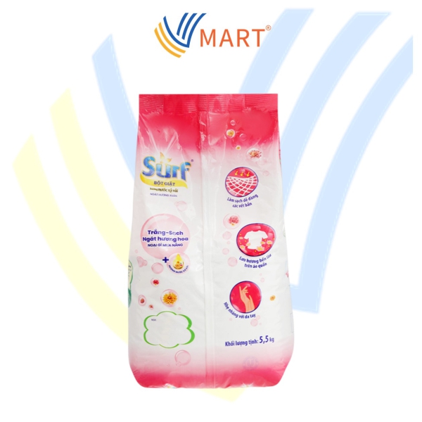 • Bột giặt Surf ngát hương xuân với công thức làm sạch bằng bọt oxy giúp dễ dàng đánh bay mọi vết bẩn và loại bỏ mùi hôi khó chịu với hương thơm ngát hương xuân từ nước xả vải. Đặc biệt, sản phẩm còn rất nhẹ nhàng với da tay, an toàn và không gây kích ứng da người dùng.