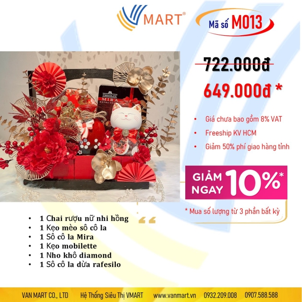 Giá giảm 30% (SL: 10), chưa VAT. Quà tặng: Hộp bánh Danisa 90g/ Lốc Pepsi Tết (6 lon). Bao gồm: 1 chai rượu Nữ Nhi Hồng, 1 kẹo mèo socola, 1 socola Mira, 1 kẹo mobillete, 1 nho khô Diamond, 1 socola dừa rafesilo