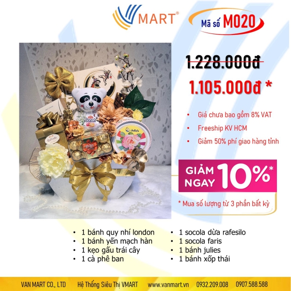 Giá giảm 30% (SL: 10), chưa VAT. Quà tặng: Hộp bánh Danisa 90g/ Lốc Pepsi Tết (6 lon). Bao gồm: 1 Bánh quy nhí London, 1 Bánh yến mạch Hàn Quốc, 1 Kẹo gấu trái cây, 1 Cà phê Ban, 1 Socola dừa Rafesilo, 1 socola Faris, 1 bánh Julies.