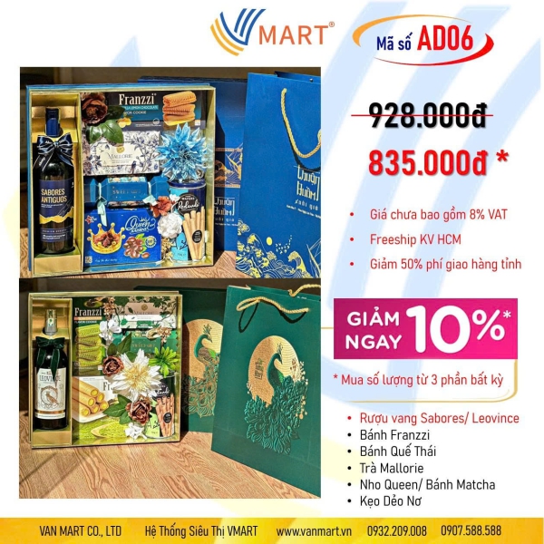 Giá giảm 30% (SL: 10), chưa VAT. Quà tặng: Hộp bánh Danisa 90g/ Lốc Pepsi Tết (6 lon). Bao gồm: Rượu vang Sabores/Leovince, Bánh Franzzi, Bánh Quế Thái, Trà Mallorie, Nho Queen/Bánh Matcha, Kẹo Nơ Trang Trí