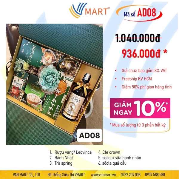 Giá giảm 30% (SL: 10), chưa VAT. Quà tặng: Hộp bánh Danisa 90g/ Lốc Pepsi Tết (6 lon). Bao gồm: Rượu vang/Leovince, Bánh Nhật , Trà spring , Cfe crown, socola sữa hạnh nhân , sôcla quả cầu