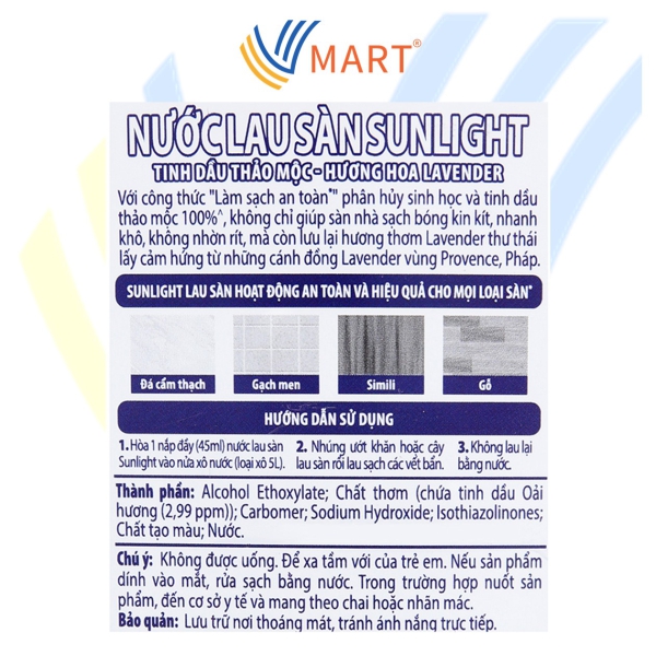 • Hướng dẫn sử dụng: Hoà 1 nắp đầy Sunlight lau sàn vào nửa xô nước (loại xô 5L). Nhúng ướt giẻ rồi lau sạch các vết bẩn. Không lau lại bằng nước