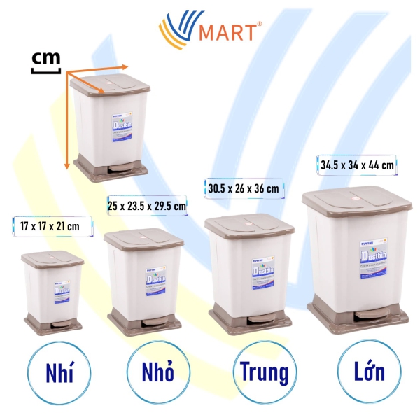 •    Thùng rác có các kích thước dài x rộng x cao như sau: Thùng Rác Đạp Nhí: 17 x 17 x 21 cm, Thùng Rác Đạp Nhỏ: 25 x 23.5 x 29.5 cm, Thùng Rác Đạp Trung: 30.5 x 26 x 36 cm, Thùng Rác Đạp Lớn: 34.5 x 34 x 44 cm